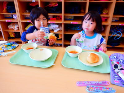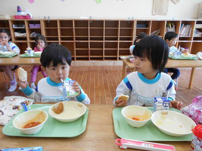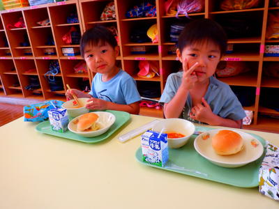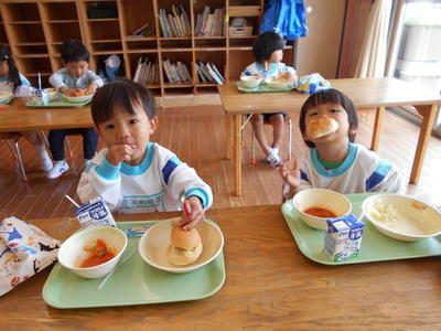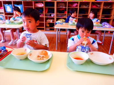 もも組さんが、はじめての給食を食べました。いっぱい遊んでおなかペコペコ。「おいし~い!」とみんなとびきりの笑顔でした。