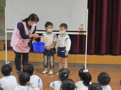 今日のメニューの中にある、「肉団子スープ」がどんなお鍋で作られているか写真を見せて子どもたちにクイズ形式で紹介してくれました。