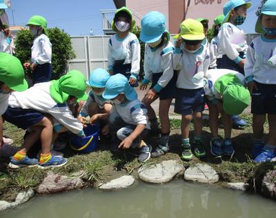 地域の方がくれた、小さいザリガニたちは、ビオトープへ逃がすことにしました。