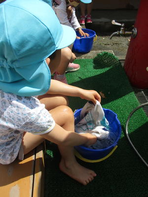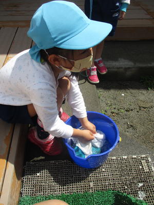 見よう見真似で、同じようにバケツに水を張り、服を入れて「ごしごし、ごしごし」と服を洗います。