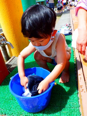 天気のいい日。服が汚れてしまった年長児が、バケツを使って服を洗っていました。