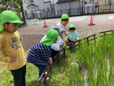 年長児が飾った笹飾りに見入る年中さんたち。「素敵な飾りだね。作ってみたいな。」