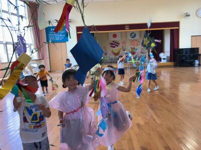 4日(木)に、子どもたちは、作った飾りや願い事を書いた短冊を、クラスごとの笹に飾り付けました。そして、七夕会を行う遊戯室に、全クラスの笹を飾りました。