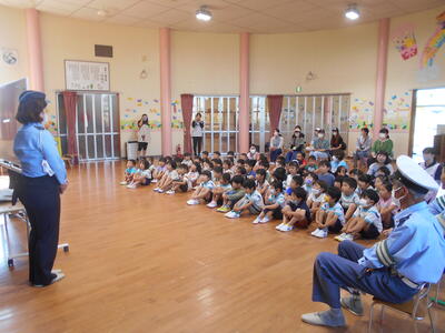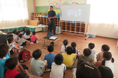 7月18日(火)、袋井消防署予防課の皆さんにおいでいただき、「防火・防災、花火教室」を行いました。防火のDVDやクイズで、火の恐ろしさや危険な火遊び等について学びました。