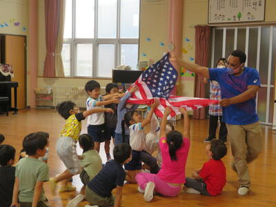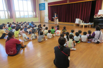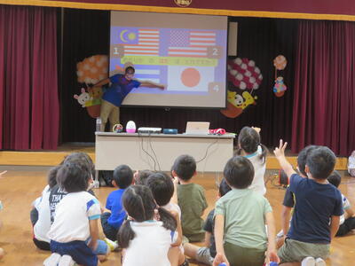 5月31日に、袋井市の国際交流員のディニーアさんを迎え、年長児の「ハローイングリッシュ」を行いました。子どもたちが、異文化に触れ、英語やディニーアさんの国(アメリカ)に興味をもつ機会になりました。初めは、英語で挨拶を返すことに恥ずかしそうな子どもたちも、ディニーアさんの話を聞いたりクイズをしたりするうちに、表情も和らぎ、交流を楽しみました。