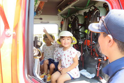 その後、年長児は、安全な花火の遊び方を教えていただき、実際に一人一人花火をやってみました。消防車に乗ったり、消防士のヘルメットをかぶったりして、消防士の気分も味わうことができました。