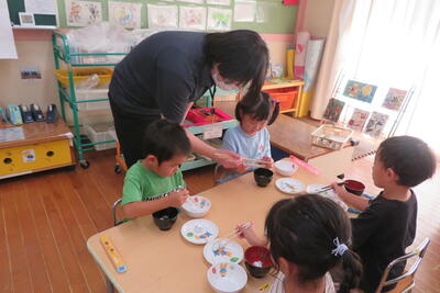 子どもたちは、正しいお箸の持ち方を教わると、ホイルで作った玉をお椀からお皿に移すことにチャレンジ。上手に玉をはさんでお皿に移すと、とても嬉しそうでした。
