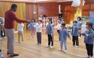 園長は、毎朝、プール前で登園してくる子どもや保護者の方に挨拶をしています。始業式の話の中で、「3学期は、「あいさつたい」と書かれたたすきを掛けて、挨拶をするので、一緒に挨拶隊をやりたい子は、プール前に来てね。」と、伝えました。始業式翌日の9日から、挨拶隊をやってみたいという子どもが何人か来て、登園してくる友達に、「おはようございます。」と挨拶をしています。