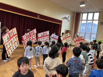 最後に、完成したひな壇を見ながら「うれしいひなまつり」を歌いました。自分たちで作ったひな壇をうれしそうに眺めながら、元気な歌声を響かせました。