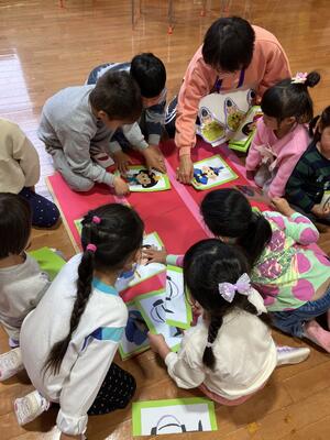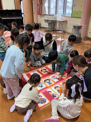 ひな人形に詳しくなったところで、異年齢グループに分かれ、おひな様絵合わせゲームをしました。同じグループの友達とカードを合わせて、ひな人形を作って並べ、ひな壇を作りました。園に飾ってある、ひな壇を見ながら、三人官女や五人囃子の順番を考えたり、絵を貼る場所を相談したりしていました。年長児、年中児がリーダーになって、グループをまとめ、ひな壇を見事完成させました。