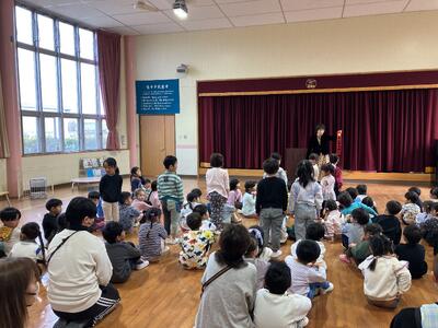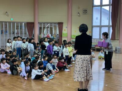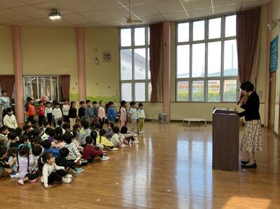 みんなで園歌を歌った後、園長の話を聞きました。始業式で園長から話があった「3学期に頑張りたいこと」ができたかどうか、振り返りました。「頑張った。」という子が多くいました。挨拶では、「あいさつ隊」に参加した子たちが紹介され、恥ずかしがりながらも、誇らしそうでした。また、クラス担任に聞いた、『1年でどんなクラスになったか』が紹介されると、うれしそうな表情で話を聞いていました。元気いっぱいに遊び、いろいろなことに挑戦し、大きく成長した1年でした。