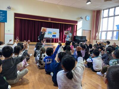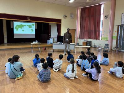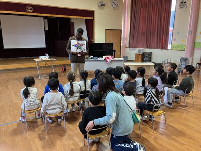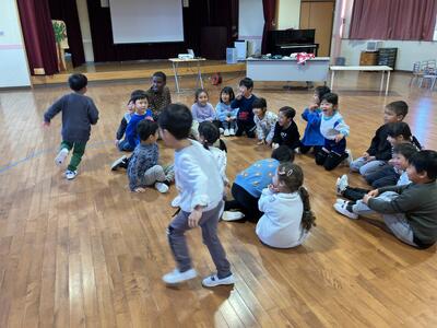 ウォームアップでは、「きらきら星」の英語版を一緒に歌ったり、歌詞に合わせてダンスをしたりしました。次に、マイケルさんの故郷であるアメリカの紹介や国旗クイズなどをしました。英語ゲームでは、簡単な英単語を教そわり、単語の絵が描かれているカードを使って、フルーツバスケットを楽しみました。英語の絵本の読み聞かせもしていただきました。質問タイムや子どもたちのやりたい遊びでたくさん触れ合うことができました。