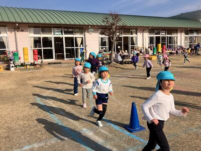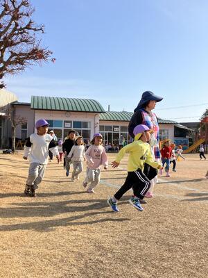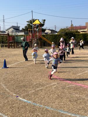 駆け足の音楽が流れると、子どもたちは、園庭を元気よく走りだします。前後半に分かれて走るので、見学しているときは、走っている友達を、力いっぱい応援しています。
