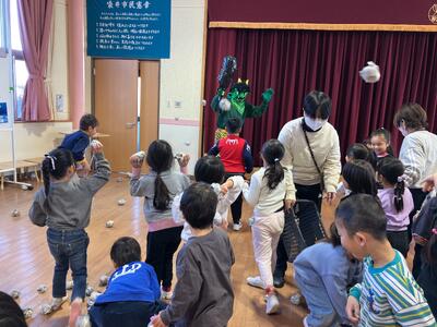 節分の由来を聞いたりクイズに答えたりした後、朝の体操でも踊っている、「オニのまつり」を踊りました。楽しく踊っていると、、、後ろから踊りながら鬼が登場!