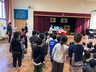 始業式では、園歌を元気よく歌った後、園長の話を聞きました。3学期に頑張りたいこととして、「1・2月は、1年で一番寒い時期だけれど、元気よくこども園に来て、友達と仲良く遊ぶこと」 「やってみたいことに挑戦し、好きをいっぱい増やすこと」 「元気よく挨拶をする、挨拶されたら挨拶を返すこと」の話がありました。最後に、各クラスお年玉をもらい、何だろう?とわくわく顔の子どもたちでした。